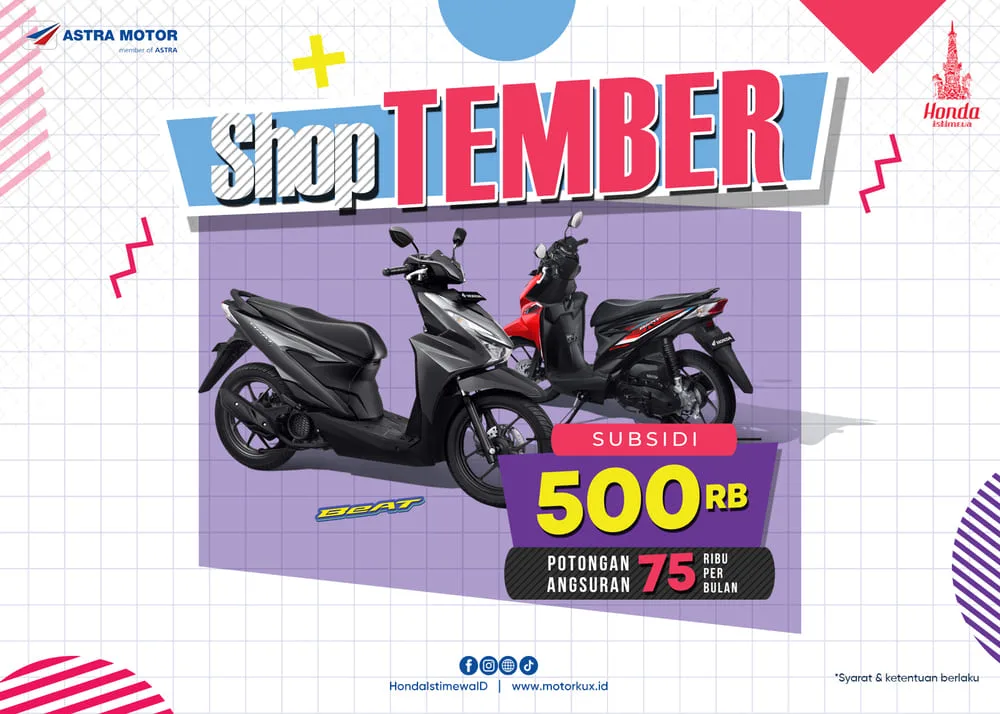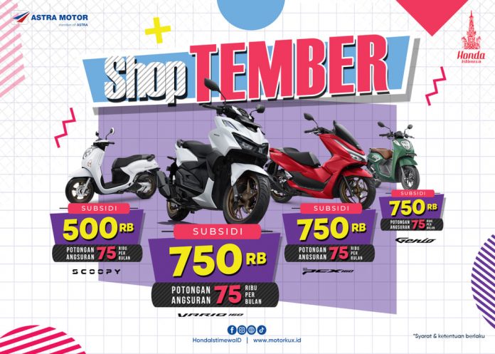 BalapMotor.Net – Pecinta sepeda motor Honda di wilayah Yogyakarta, Kedu, dan Banyumas kembali dimanjakan dengan program penjualan spesial dari Astra Motor Yogyakarta. Program spesial bertajuk ShopTEMBER ini memberikan subsidi dan potongan angsuran per bulan bagi konsumen sepeda motor Honda yang melakukan pembelian sepanjang bulan September. Astra Motor Yogyakarta memberikan subsidi dan potongan angsuran per bulan untuk seluruh segmen sepeda motor matic dan segmen sport.