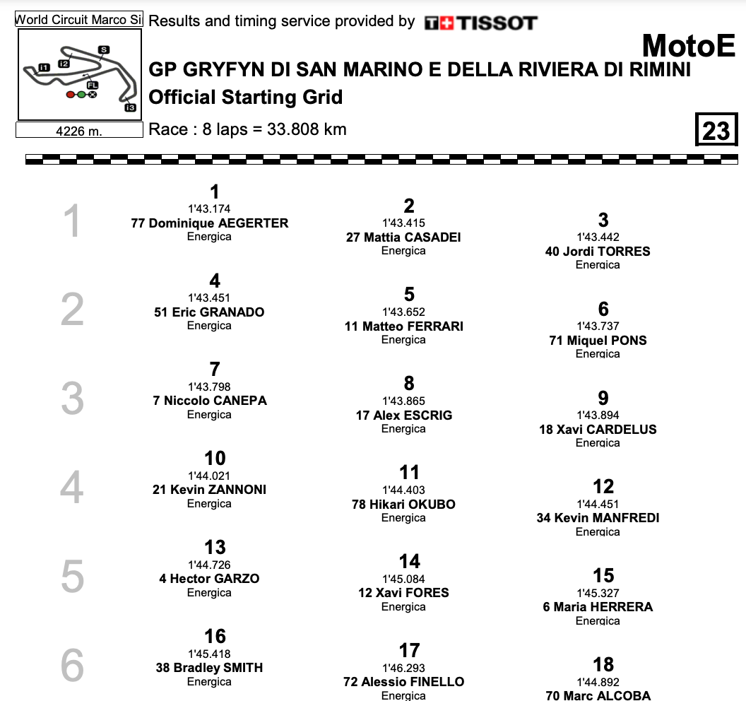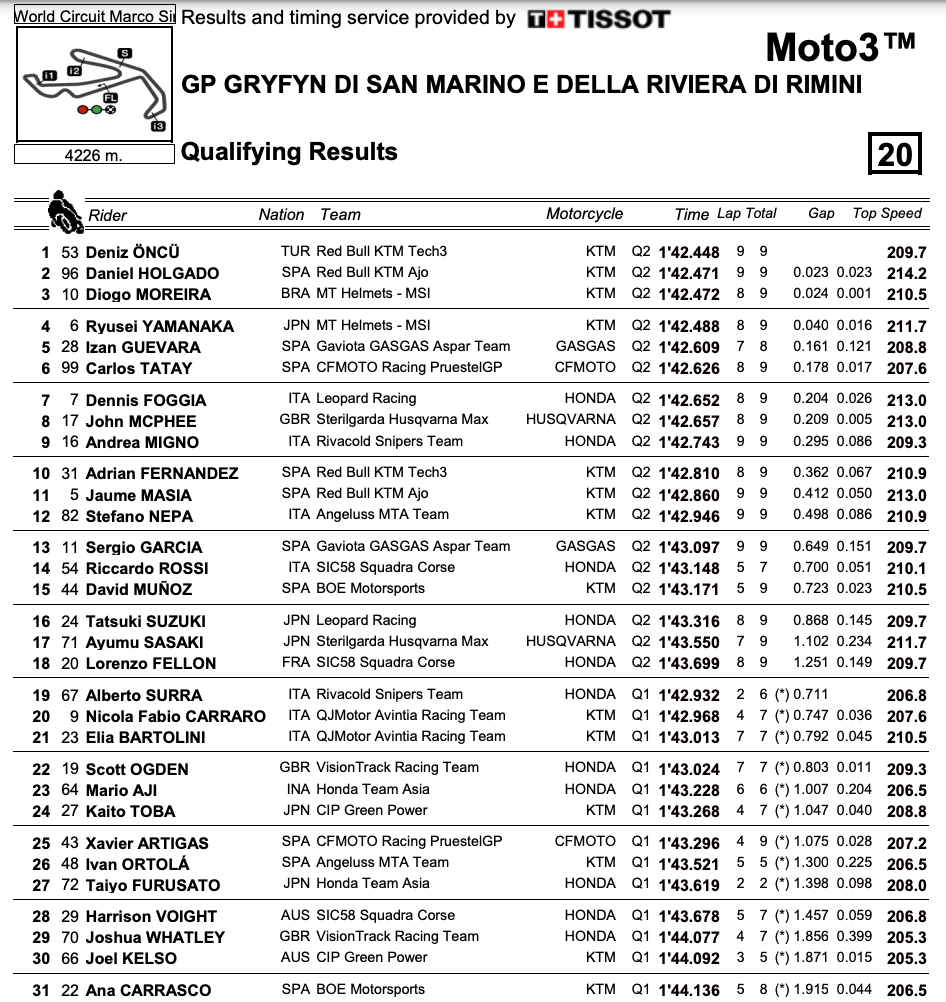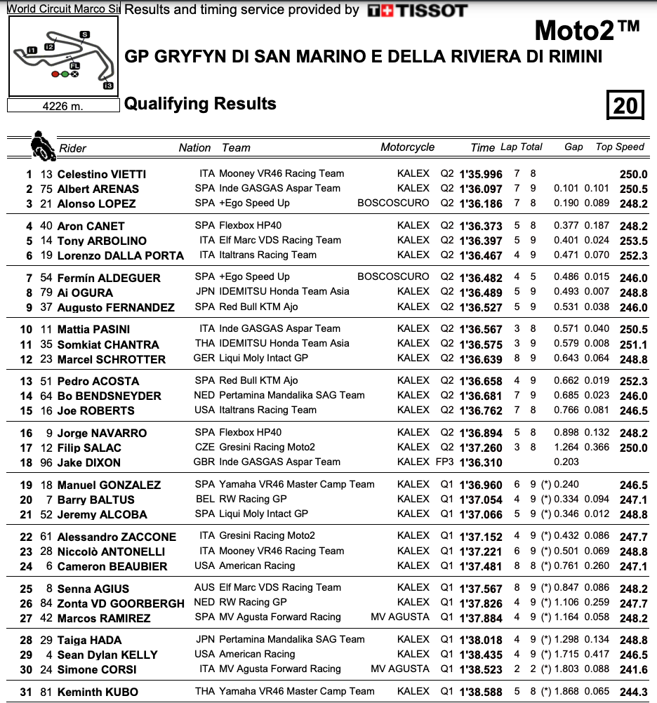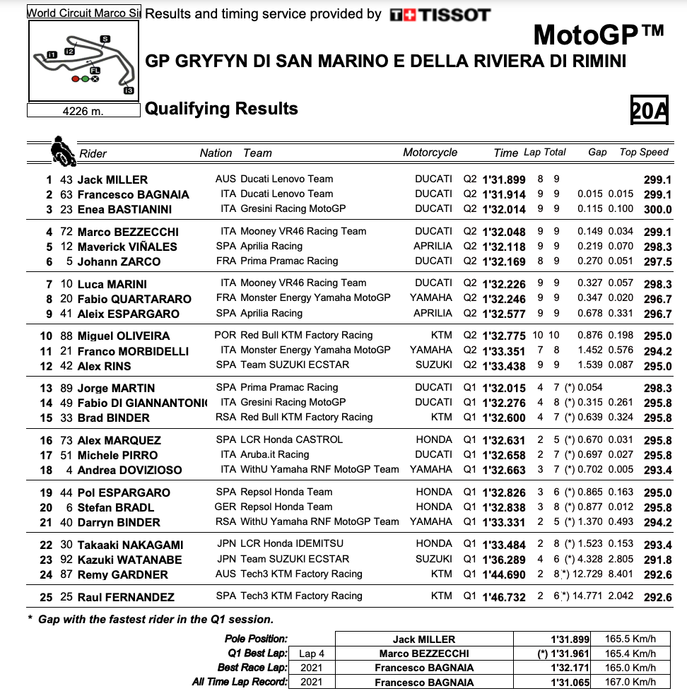 Lanjut pada posisi ketiga diraih oleh Enea Bastianini (Gresini Racing MotoGP) dengan time 1 menit 32.014 detik, sementara itu pada posisi keempat diisi oleh Marco Bezzecchi (Mooney VR46). Berikut hasil QTT MotoGP San Marino semua kelas.