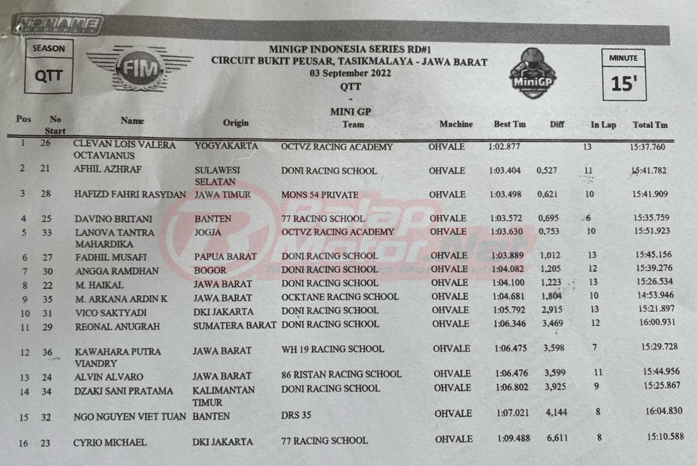 BalapMotor.Net – Setelah berkuasa pada sesi FP1 dan FP2, Clevan Louis Valera Octavianus kembali menjadi pembalap tercepat pada sesi QTT seri 1 FIM MiniGP Indonesia Series 2022 yang digelar di sirkuit Bukit Peusar Kota Tasikmalaya, Sabtu 3 September 2022.