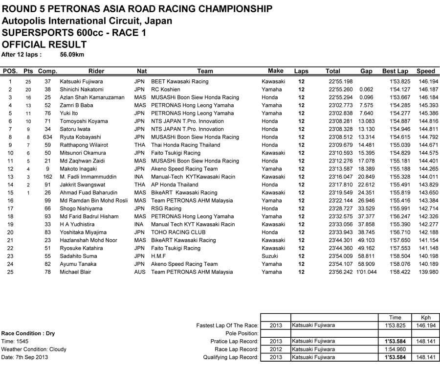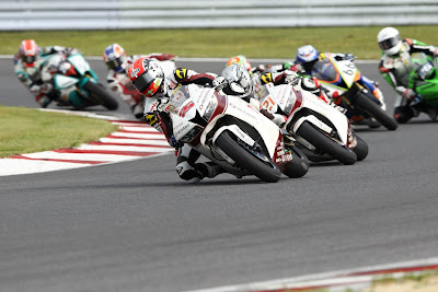 Azlan Shah Kamaruzman memang buat rider di Asean saat ini merupakan yang terbaik jika menurut balap-motor.com, dari beberapa tahun ini dialah yang mampu meladeni para senior yang datang dari jepang. Pantaslah jika dia tahun ini mulai seri MotoGP San Marino dipercaya Honda Team Asia untuk ikutan Moto2 menyusul 3 pembalap Asean lainya, jadi pengin liat aksinya nih. sementara itu pembalap Indonesia yang memang hanya dua pembalap yang turun full seri belum mampu berbuat banyak di Autopolis. M.Fadli dan H. Yudhistira harus terlempar jauh dari sepuluh besar, Fadli di posisi ke- 13 dan Yudhis diposisi ke 19. Sementara itu pembalap Astra Racing Team yang jadi wildcard di Suzuka dan Autopolis tidak bisa mengikuti race dikarenakan cedera kaki kanan yang disebabkan kecelakaan saat race di Suzuka minggu lalu bertambah parah saat babak kualifikasi kemarin. Cepat sembuh Bro. DL