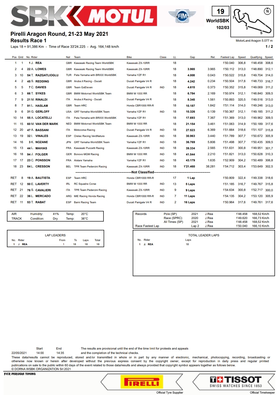 BalapMotor.Net – Partai pembuka Kejuaraan Dunia FIM Motul Superbike 2021 yang berlangsung di sirkuit MotorLand Aragon, Spanyol telah menyelesaikan Race 1 (22 Mei).