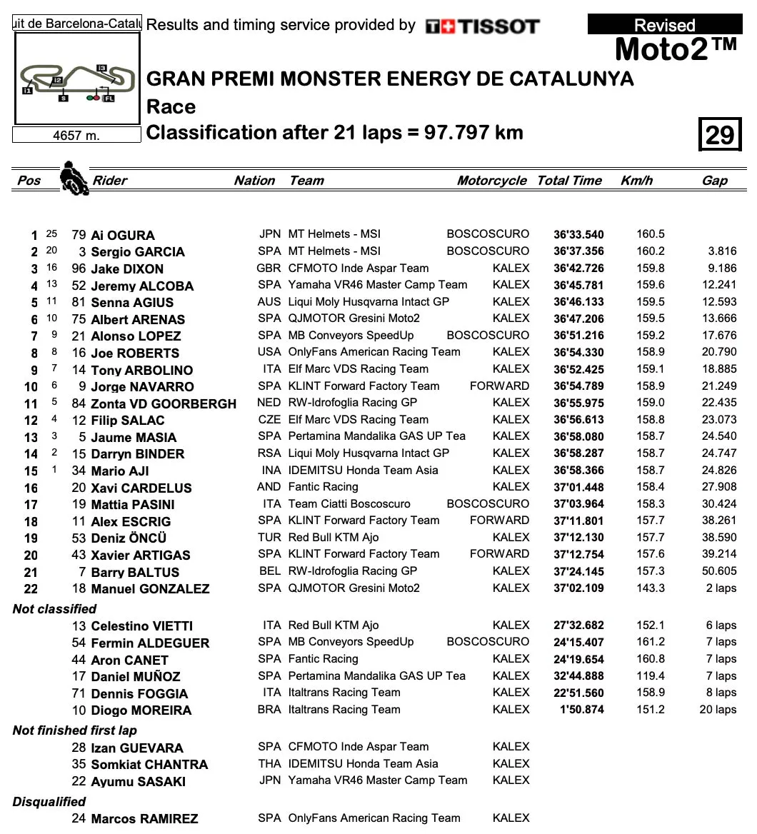 Pembalap asal Magetan, Jawa Timur yang membela pasukan Honda Team Asia ini berhasil finish ke-15. Mario Aji yang belum 100% fit setelah operasi arm pump ini start dari grid ke-27, tentunya hasil tersebut cukup istimewa.