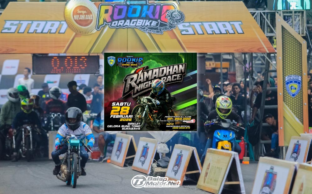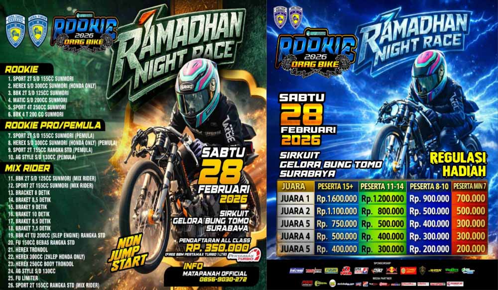 BalapMotor.Net – Matapanah Rookie Drag Bike siap menyajikan balap lurus Ramadhan Night Race 2026 yang akan berlangsung di sirkuit GBT Surabaya, Jawa Timur.