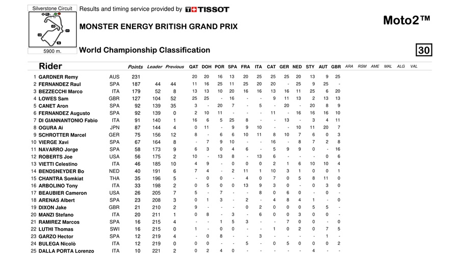 BalapMotor.Net – Raul Fernandez saat ini menjadi runner-up klasemen sementara Moto2 dibawah rekan satu tim di Red Bull KTM Ajo, Remy Gardner. Dia tertinggal 44 poin karena gagal finis dalam balapan di Silverstone.