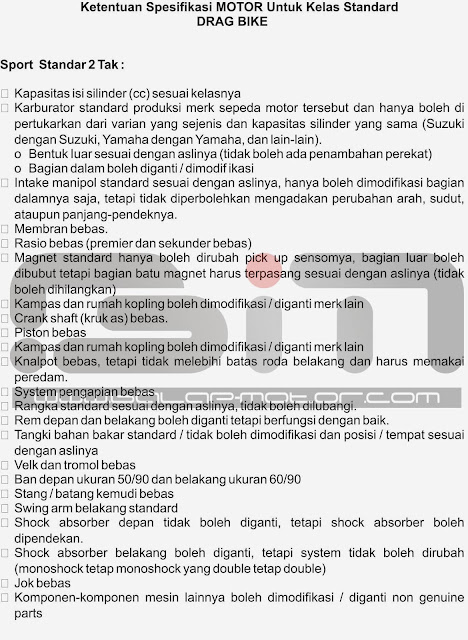 Balap-Motor.com Buat para penggemar adu kebut lurus doang alias drag bike tentu sajakepengin dong ikutan event resmi. Buat yang belum mampu buat bikin motor dengan spek tune up tentu saja boleh dong ikutan kelas Standaran, diantaranya kelas Bebek 4 tak Standar, Satria FU Standar, Bebek 2 tak Standar dan Sport 2 tak Standar. Buat regulasinya ayo monggo disimak baik-baik nih balap mania. Luvo