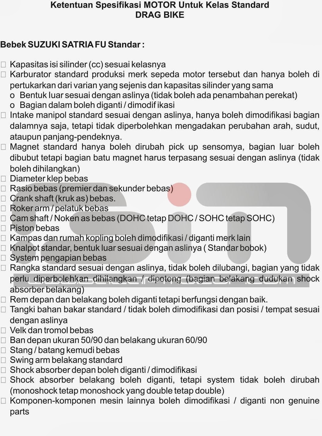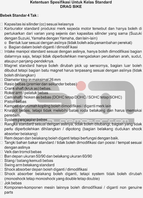 Balap-Motor.com Buat para penggemar adu kebut lurus doang alias drag bike tentu sajakepengin dong ikutan event resmi. Buat yang belum mampu buat bikin motor dengan spek tune up tentu saja boleh dong ikutan kelas Standaran, diantaranya kelas Bebek 4 tak Standar, Satria FU Standar, Bebek 2 tak Standar dan Sport 2 tak Standar. Buat regulasinya ayo monggo disimak baik-baik nih balap mania. Luvo