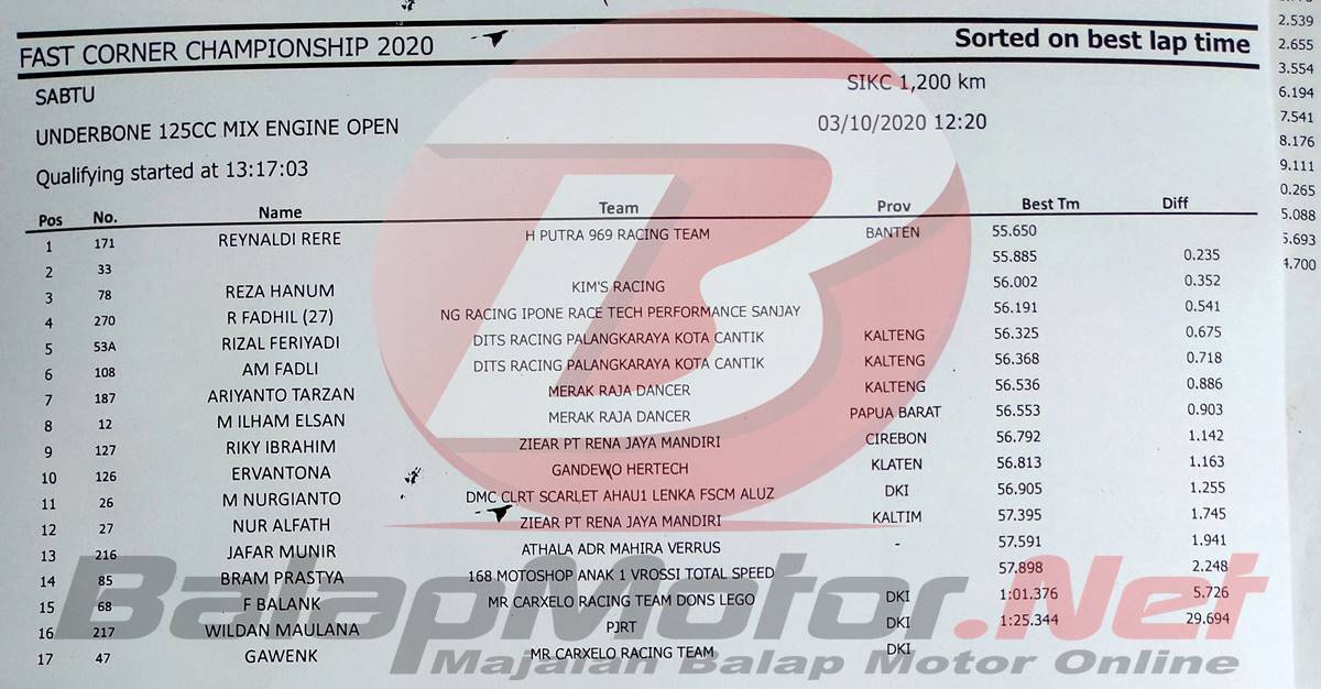 BalapMotor.Net – Reynaldi “Rere” Pradana yang membela tim H Putra 969 Racing Team mampu menjadi yang tercepat dalam sesi kualifikasi kelas unggulan Underbone 125cc Mix Engine Open pada gelaran Fast Corner Championship 2020 (3/10).