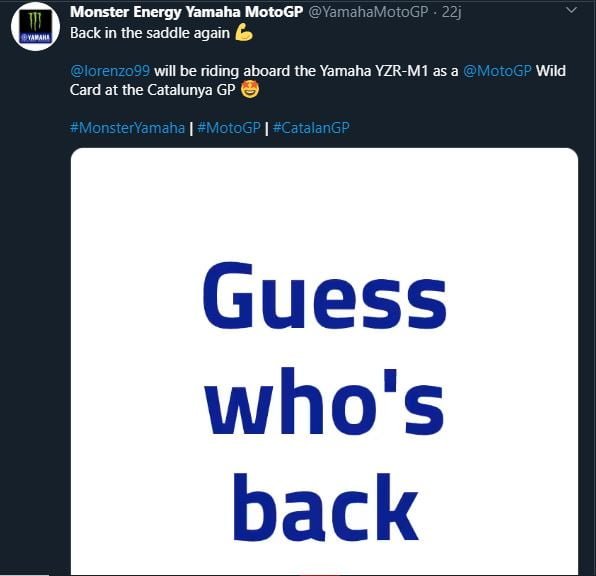 BalapMotor.Net – Yamaha factory Racing telah mengumumkan secara resmi bahwa Jorge Lorenzo bakal turun sebagai pembalap Wild card di MotoGP seri Catalunya pada 5-7 Juni 2020. Hal tersebut telah diumumkan melalui akun twitter resmi milik tim Yamaha Monster Energy.