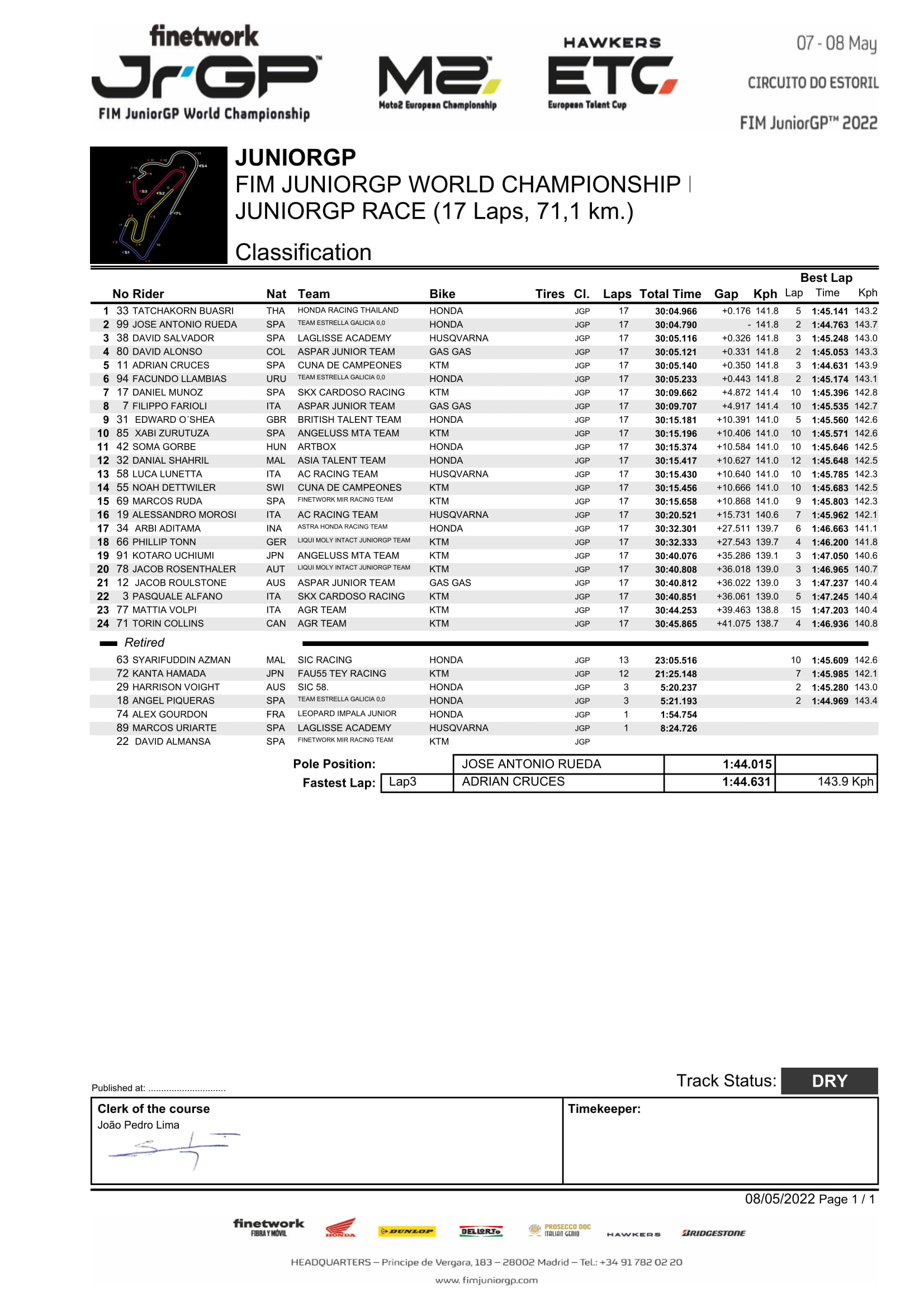 BalapMotor.Net – Pembalap Thailand Tatchakorn Buasri berhasil menjadi jawara pada race perdana FIM Junior GP kelas JuniorGP musim 2022 yang digelar di sirkuit Estoril, Portugal (8/5).