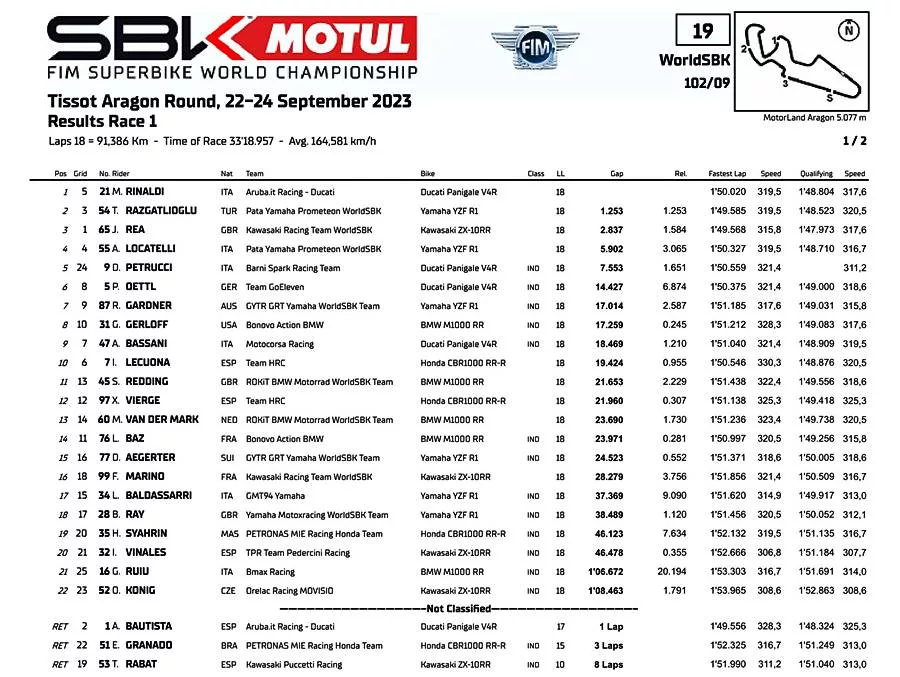 “Luar biasa! Di Aragon, hal-hal aneh terjadi, saya memenangkan balapan pertama saya di sini dan kemudian kemenangan hari ini adalah salah satu yang terbaik. Saya memutuskan untuk tidak menyerah dan inilah saya, sangat bahagia dan menikmati momen ini.” ungkap Rinaldi.