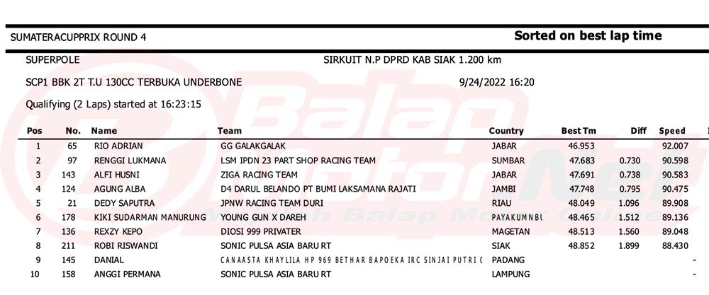Rio yang menunggangi Yamaha 125Z garapan Thoriq Cendana ini mampu mencetak best time 47.097 detik, lalu di ikuti Alfi Husni tine 47.698 detik di trek NP Kawasan DPRD Kabupaten Siak, Riau,