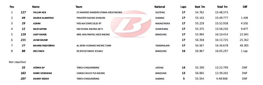 Namun, satu persatu pembalap bisa ia taklukan. Penampilan yang tenang dan juga konsisten akhirnya membuat Fallah Acil menjadi yang terbaik. “Alhamdulillah walaupun tangan pegel tapi bisa meraih juara,” senyum Fallah Acil. Sipp!! (***)
