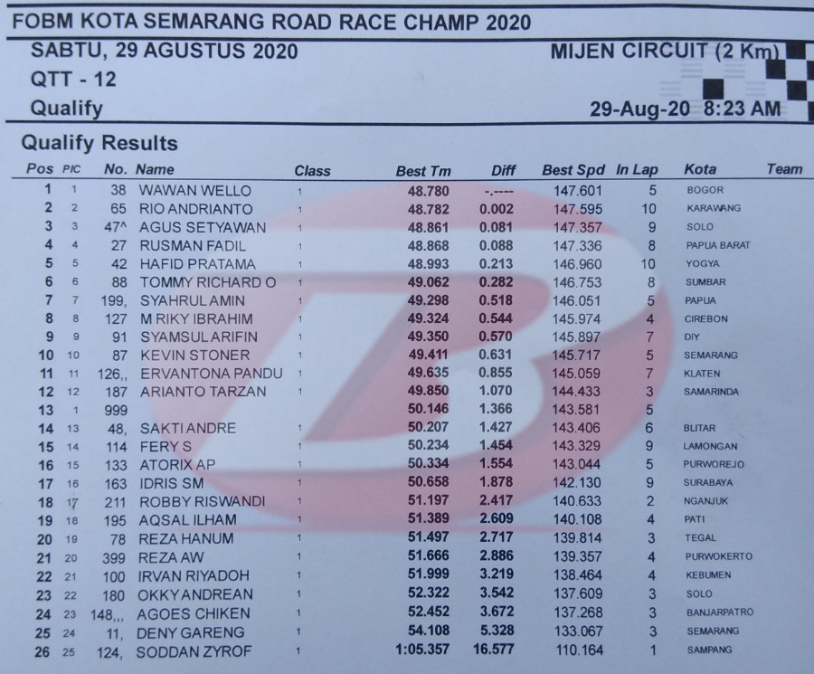 BalapMotor.Net – Underbone F1ZR Aqiella ABRT20 sukses jadi ya g tercepat dalam jalannya QTT Underbone 116cc kejuaraan FOBM Kota Semarang Road Race Championship 2020 yang berlangsung di sirkuit Mijen (29/8).