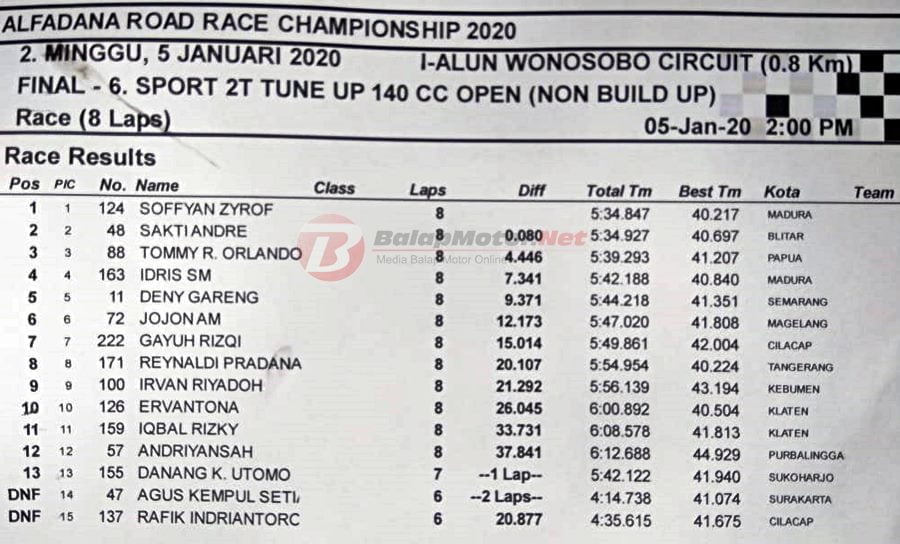 “Awal lap dirombongan tengah. Perlahan naik dan akhirnya bisa mengejar Sakti di lap terakhir,” senyum Sofyan yang terpantau istimewa pada trek basah.