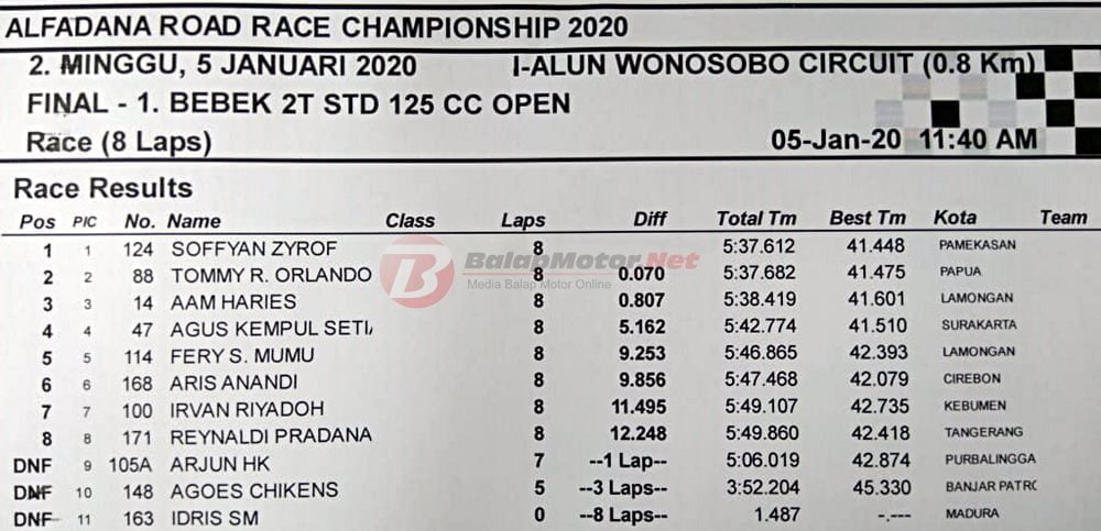 BalapMotor.Net – Sofyan Zyrof dengan tim barunya sukses merebut gelar juara bebek 2T STD 125cc dalam kejuaraan balap motor bertajuk Alfadana Road Race Championship 2020 yang berlangsung di sirkuit NP. Alun-alun Wonosobo (5 Januari).