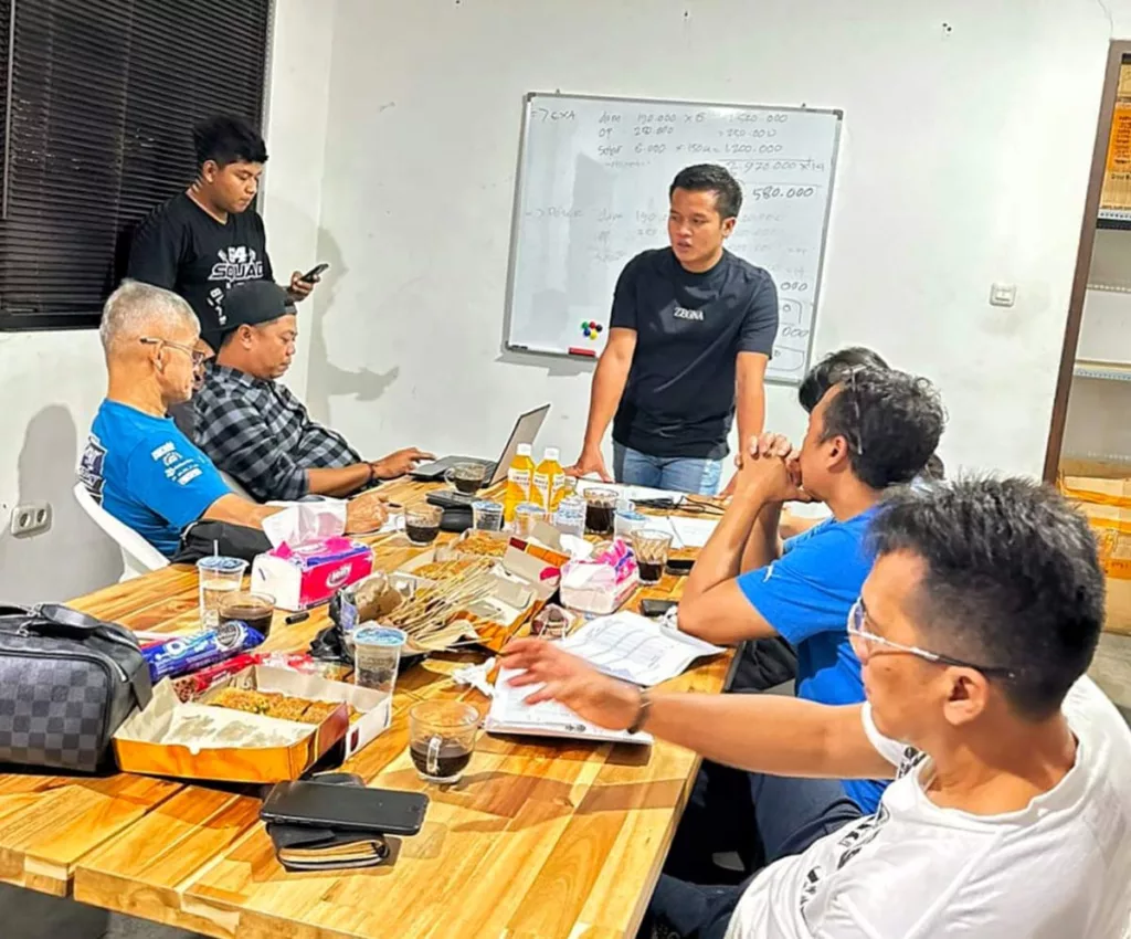 Tampak Mevans Sanggramawijaya Ketua Komisi Motocross IMI Pusat, dalam program kunjungan kerja perdana di 2023, bertandang ke kota Bandung, menggelar rapat terbuka bersama jajaran Pengprov IMI Jawa Barat dan mitra kerja.