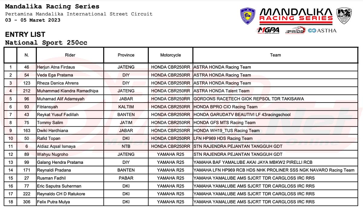 BalapMotor.Net – Sebanyak 18 pembalap nasional telah memastikan keikutsertaan nya dalam gelaran Mandalika Racing Series 2023 putaran pertama sekaligus menjadi sejarah dimulainya Kejuaraan Nasional Balap Motor 2023 di Pertamina Mandalika International Circuit, 3-5 Maret.
