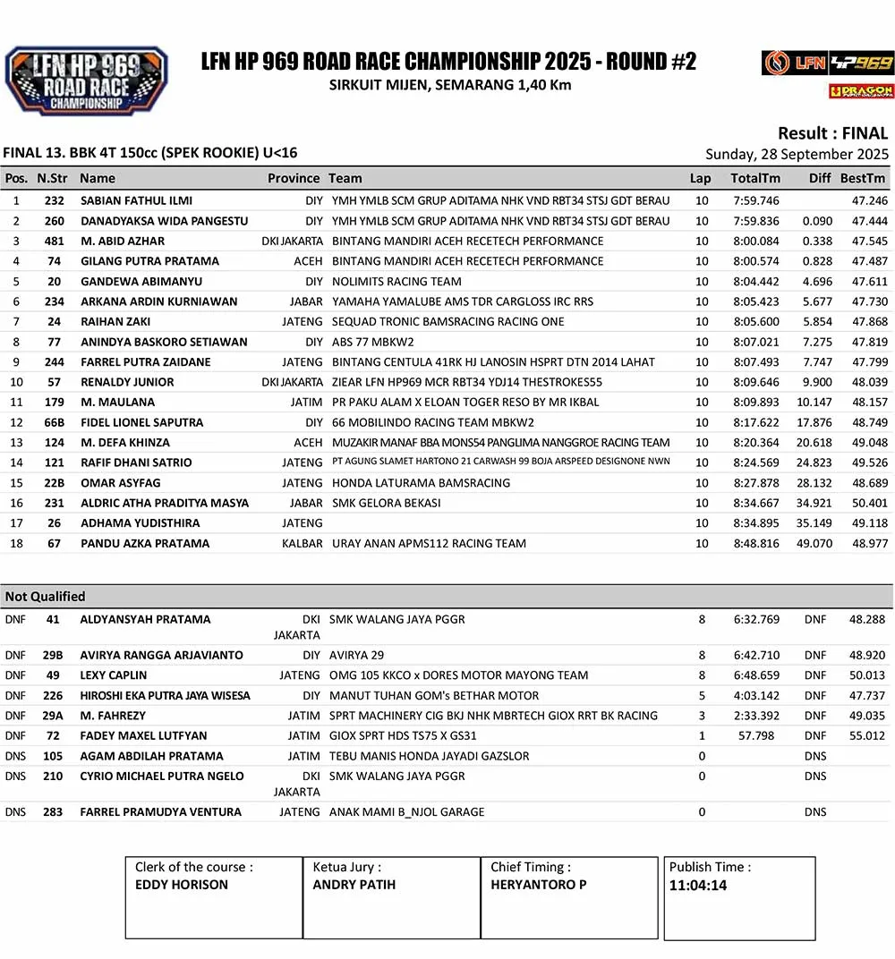 BalapMotor.Net – Bakat muda asal Kalimantan Timur kembali bersinar di kancah balap nasional. Sabian Fathul Limi, rider belia berusia belum genap 13 tahun, sukses meraih juara pada kelas BBK 4T 150cc (Spek Rookie) U-16 di ajang LFN HP969 Road Race Championship 2025 Round 2 yang berlangsung di Sirkuit Mijen, Semarang (28/9).
