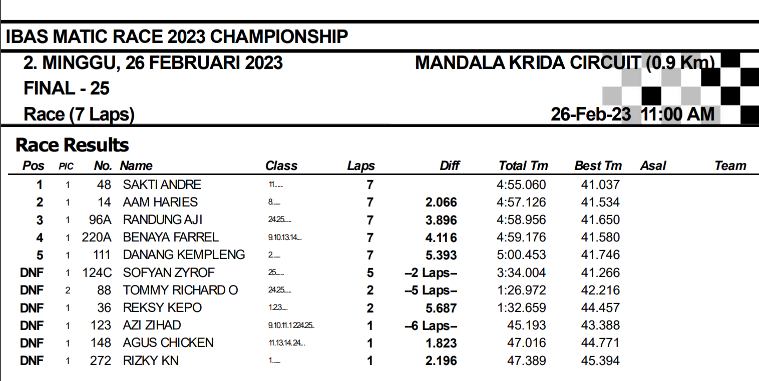 Namun, akhirnya Aam Harus mampu di overtake oleh Sakti Andre yang langsung memimpin dengan santai sampai bendera finish dikibarkan.