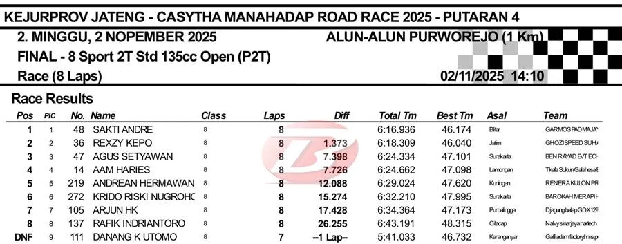 BalapMotor.Net – Sakti Andre berhasil menjadi yang raja di pertarungan Sport 2T STD 135cc Kejuaraan Casytha Manahadap Road Race putaran keempat yang berlangsung di sirkuit NP. Alun-alun Purworejo (2/11).