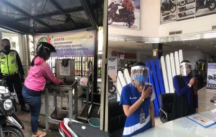 SOP protokol kesehatan yang telah diterapkan di dealer-dealer Yamaha area Jabodetabek adalah dengan menyediakan fasilitas cuci tangan atau hand sanitizer, melakukan penyemprotan disinfektan sebelum dealer beroperasi, menyediakan kursi tunggu dengan pembatasan jarak.