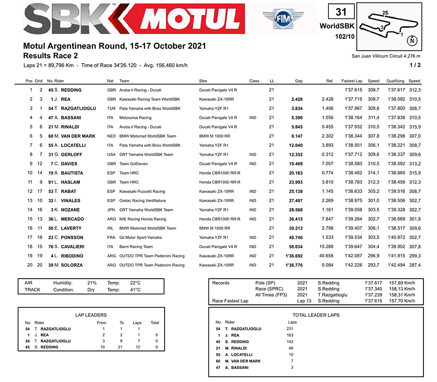Namun tambahan 25 angka ini tidak cukup untuk mempertahankan peluangnya meraih gelar juara dunia musim ini. Setelah seri Argentina selesai, Redding tertinggal 66 poin dari Toprak. Sementara seri terakhir di Indonesia hanya akan merebutkan 62 poin.