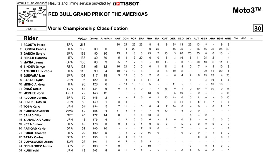 Pedro Acosta (Red Bull KTM Ajo) masih berdiri tegak di posisi terbaik. Tapi dia mulai dikejar oleh Dennis Foggia (Leopard Racing) yang saat ini hanya terpaut 30 poin. Di urutan ketiga yang ditempati Sergio Garcia juga masih mempunyai peluang untuk gelar.