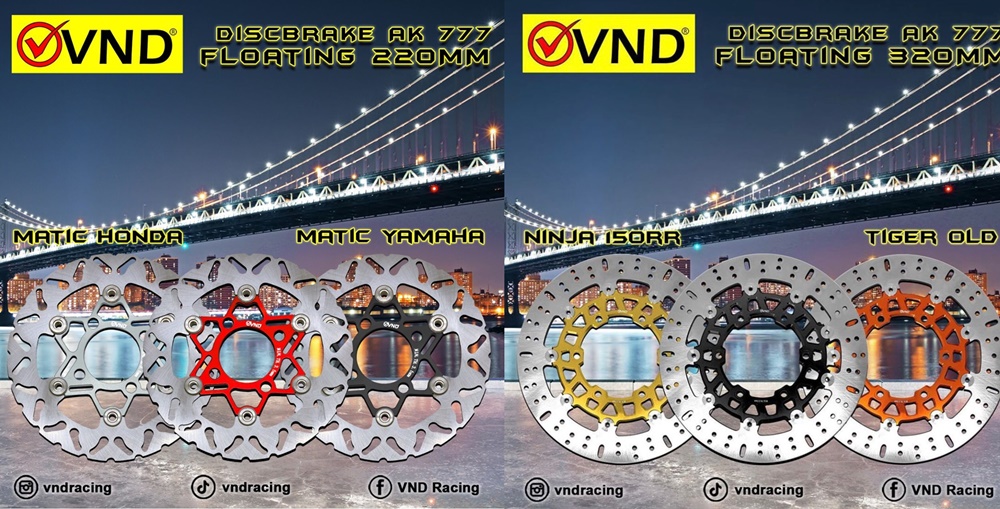 Selain untuk balap, cakram VND juga tersedia lengkap untuk motor harian. Ukuran dan pilihan warnanya banyak, ada merah, orange, kuning, biru, grey dan hitam. Seperti tipe AK 777 tersedia ukuran 220mm, 260mm, 300mm, dan 320mm. Itu bisa buat berbagai motor matic, bebek hingga kategori sport.