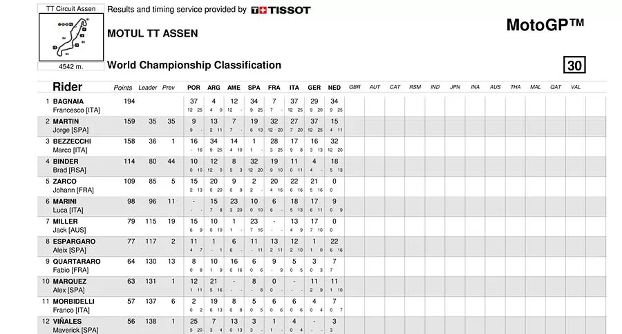Hasil ini pun diluar ekspektasinya. Saat ini Marco Bezzecchi menempati posisi ketiga klasemen sementara dengan selisih 36 poin dari Pecco Bagnaia dan hanya satu poin dari Jorge Martin di peringkat kedua.