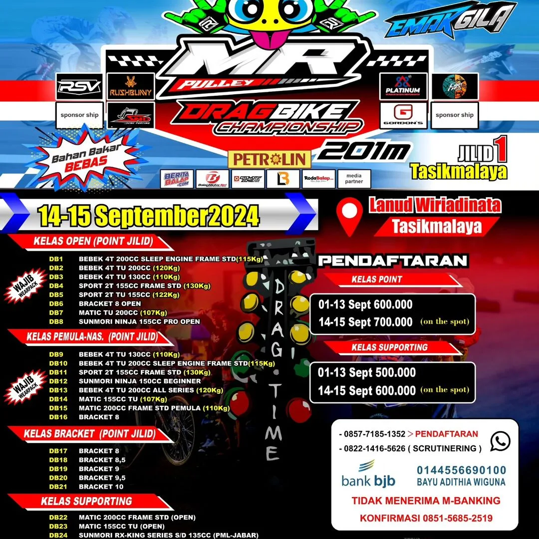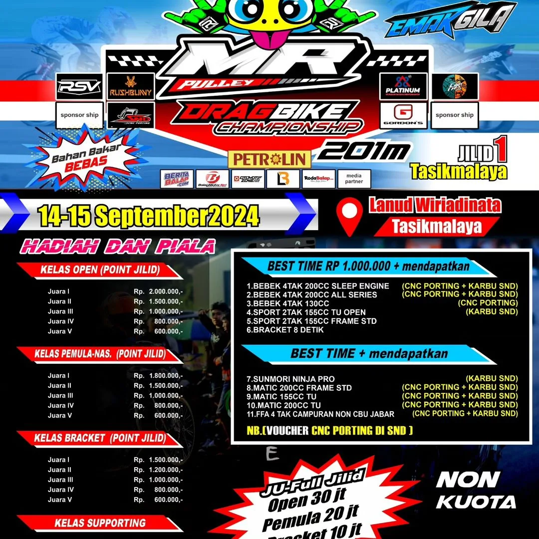 BalapMotor.Net – Dunia balap lurus tanah Sunda kembali bergairah dengan hadirnya MR Pulley Drag Bike Jilid 1 yang akan berlangsung pada 14-15 September 2024 di Lanud Wiriadinata, Tasikmalaya. Event yang digagas oleh Bayu Aditya dari Kuya Nyuruntul 36 ini menghadirkan 30 kelas, memberi ruang bagi pembalap dari berbagai level untuk bersaing.