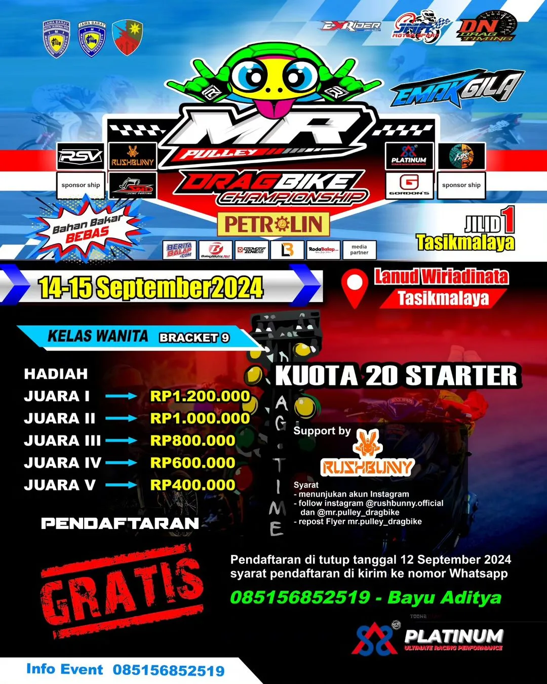 Yang menarik, gelaran ini menghadirkan kelas-kelas spesial seperti Bracket 9 Detik yang khusus untuk wanita, influencer, dan awak media, dengan pendaftaran gratis. Ajang ini tak hanya menjadi kompetisi, tetapi juga wahana untuk menginspirasi dan melibatkan berbagai kalangan dalam dunia drag bike.