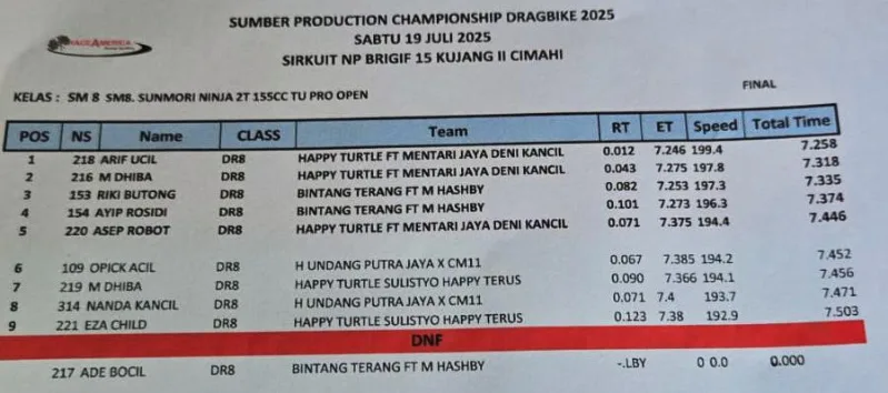 BalapMotor.Net – Kawasaki Ninja Sunmory milik tim Happy Turtle ft Mentari Jaya Deni Kancil jadi yang tercepat di kelas Sunmory Ninja 2T 155cc TU Open gelaran Sumber Production Drag Bike Championship (19 Juli 2025).