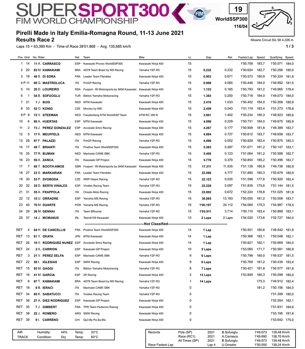 “Saya hanya ingin mengucapkan terima kasih kepada semua orang di tim, kepada Kawasaki, kepada sponsor saya, kepada keluarga saya karena mereka selalu mendukung saya. Kami harus terus bekerja untuk terus meningkatkan setiap balapan,” ucap juara dunia WSSP300 tahun 2018 itu.