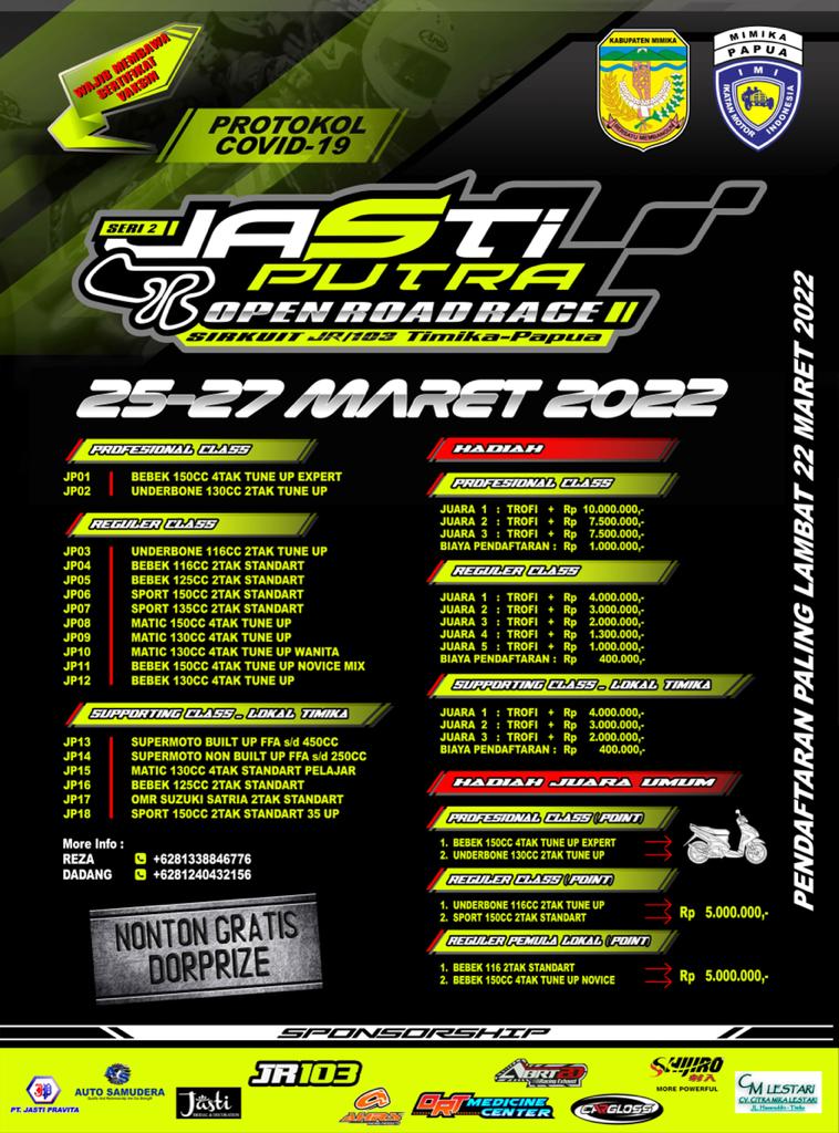 BalapMotor.Net – Kejuaraan balap motor bertajuk Jasti Putra Open Road Race 2022 siap digelar kembali di sirkuit JR |103 Timika, Papua pada akhir pekan ini (25-27/03).