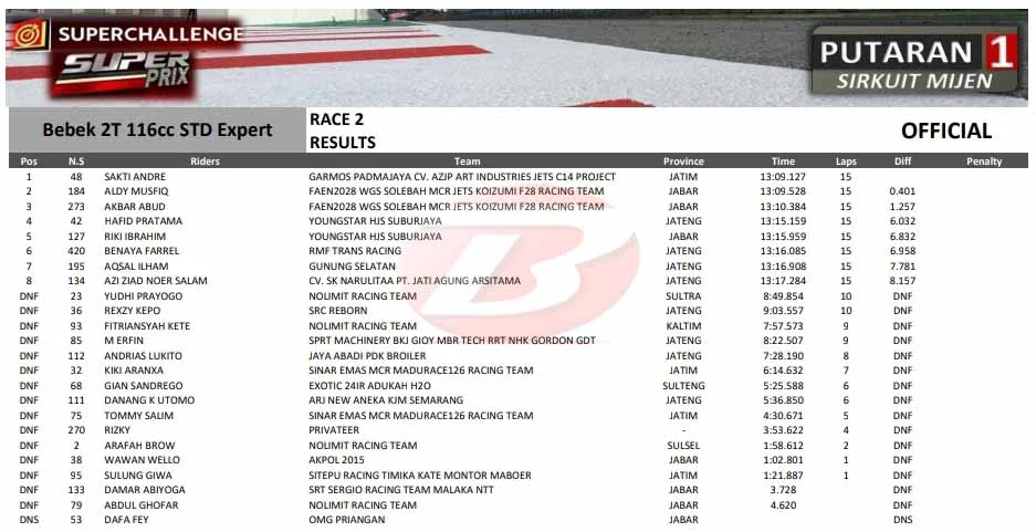BalapMotor.Net – Muncul kejutan pada Race 2 Bebek 2T STD 116cc di event Superchallenge Super Prix Seri 1 yang berlangsung di sirkuit Mijen, Semarang (31/5).