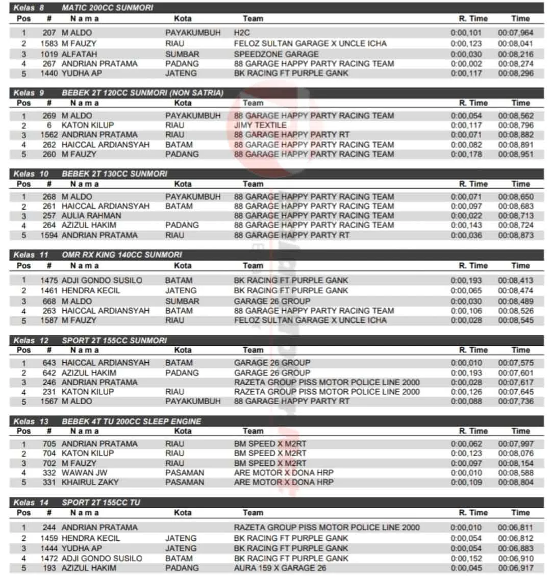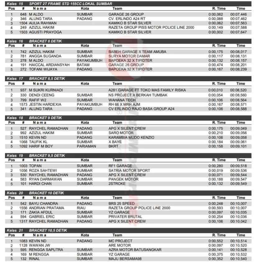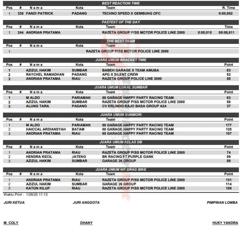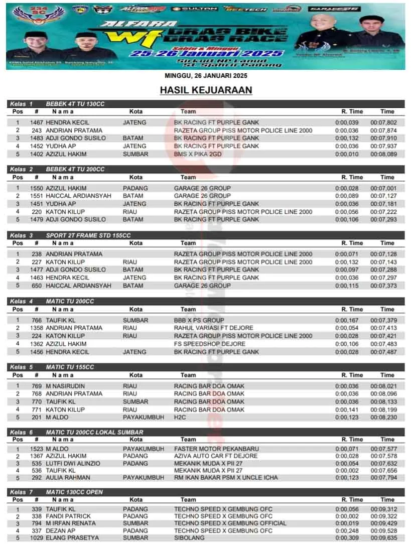 Hasil Alfara WF Drag Bike Padang 25-26 Januari 2025: