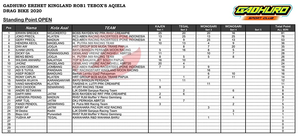 Joko dari tim RC3 Aben Racing Racertees Ipone itu menjadi yang terbaik di kelas poin open dalam putaran 4 kemarin. Tambahan 25 angka membuat dragster asal Prambanan itu sementara mengantongi 76 poin.