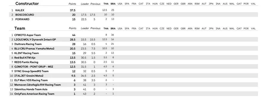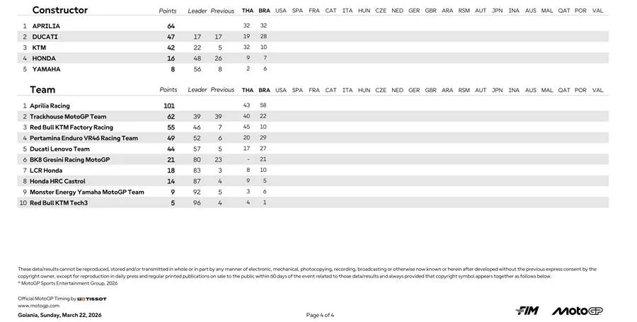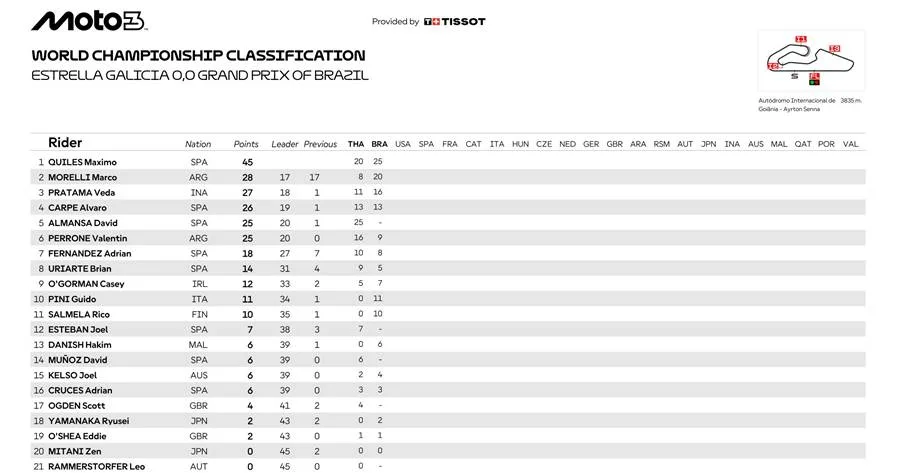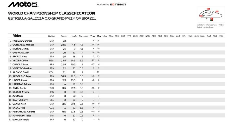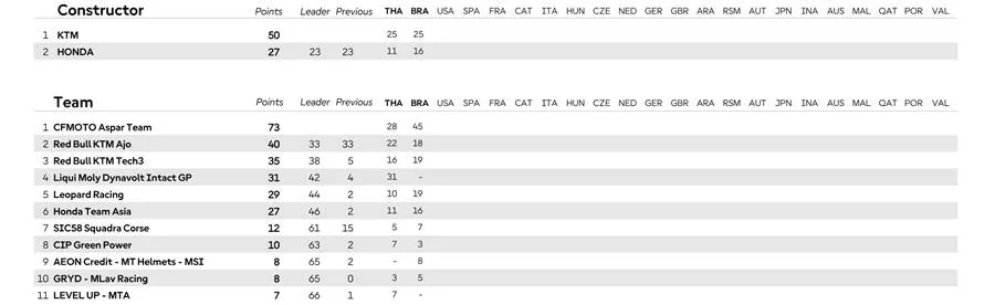 BalapMotor.Net – Berikut merupakan klasemen sementara kejuaraan dunia Moto3, Moto2 dan MotoGP setelah putaran kedua yang berlangsung di sirkuit Autodromo Internacional Ayrton Senna, Brazil pada 21-22 Maret 2026. (**)