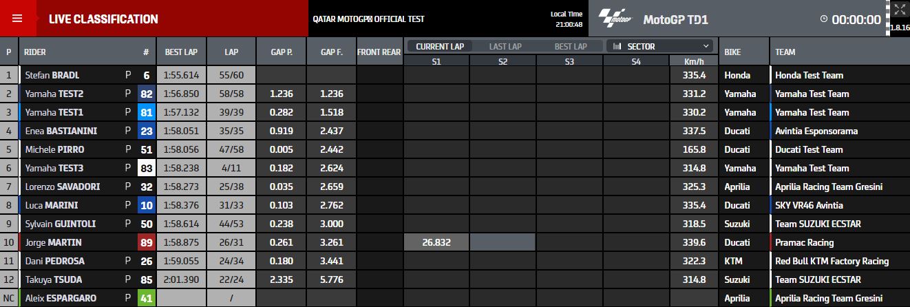 BalapMotor.Net – Test shakedown MotoGP yang berlangsung di sirkuit Losail Qatar pada hari jumat 5 maret 2021 telah usai dan sukses dikuasai oleh Stefan Bradl selaku test rider HRC.
