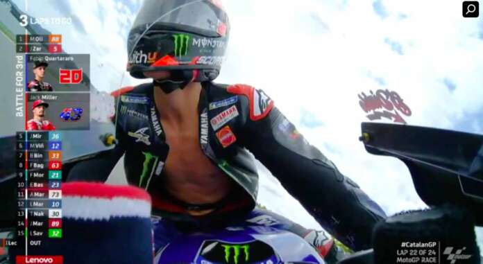 BalapMotor.Net – Kasus yang sangat jarang terjadi di dunia balap motor kelas dunia. Resleting wearpack yang digunakan oleh Fabio Quartararo (Monster Energy Yamaha MotoGP) terbuka pada tiga lap akhir race MotoGP Catalunya (6/6).
