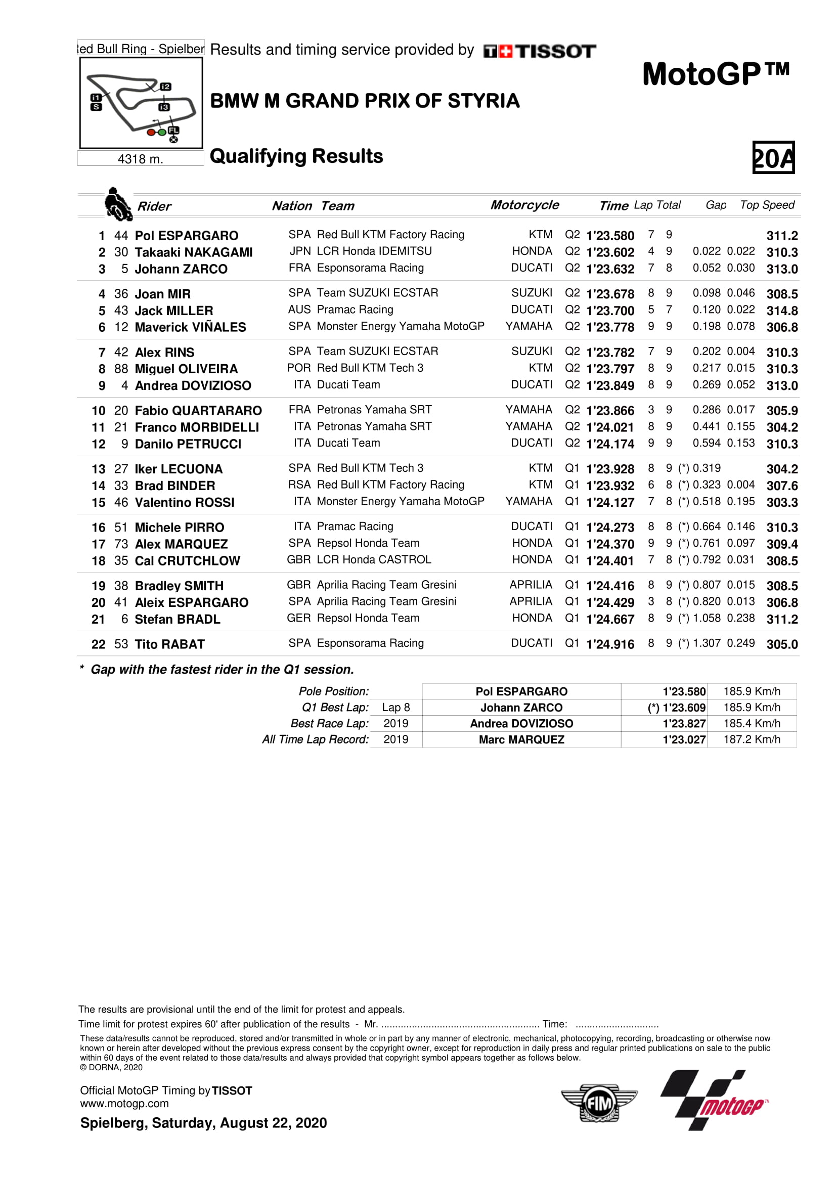 Baca Juga : Kualifikasi MotoGP Styria 2020: Pol Espargaro Raih Pole Position