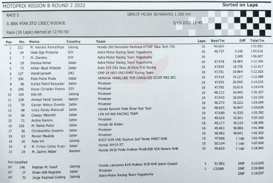 Perebutan pada posisi keempat juga cukup seru, karena ada enam pembalap yang memperbutkannya gaes. Akhirnya, Decksa Almer (ART Yogyakarta) berhasil menempati posisi tersebut.
