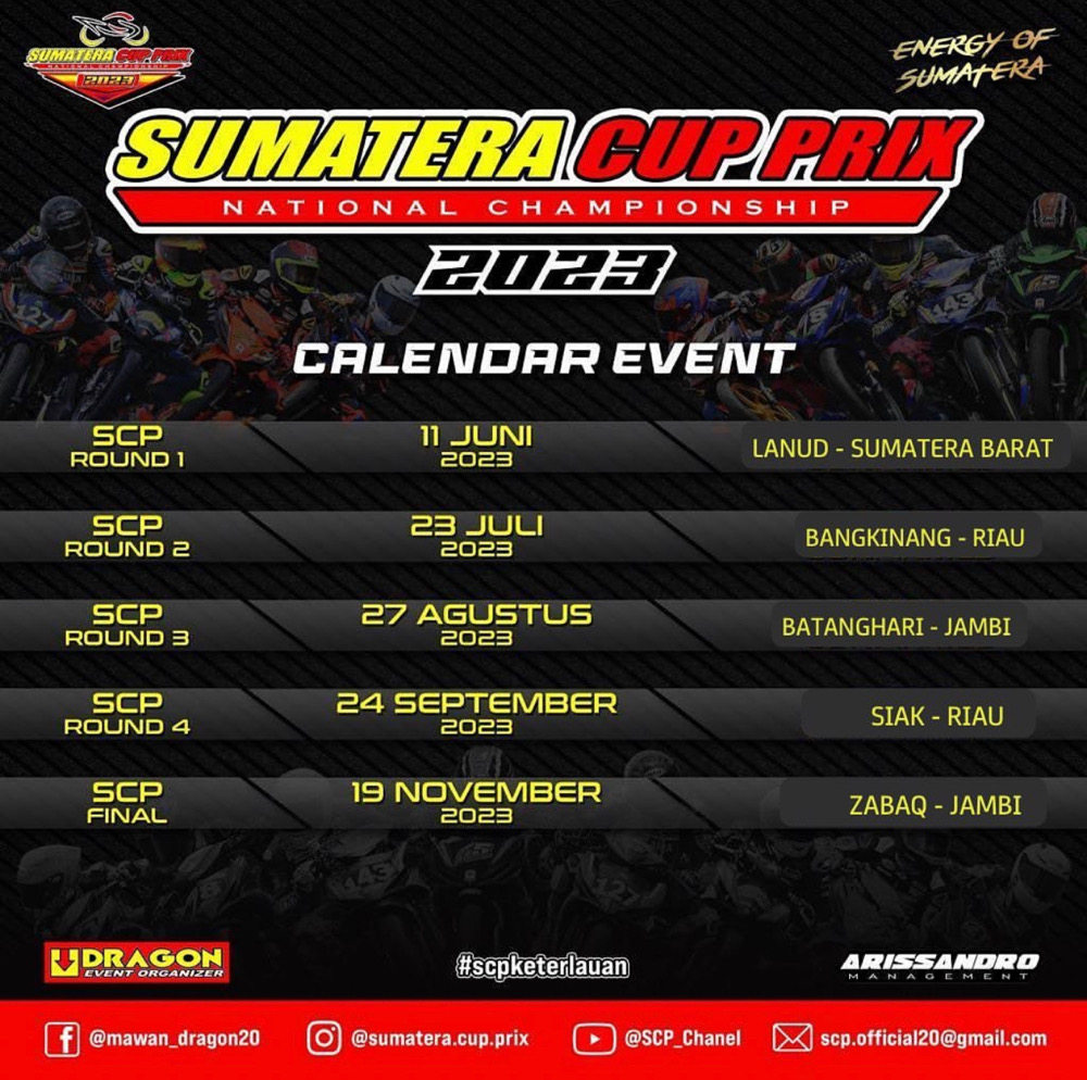 Untuk lima kota sendiri adalah di Kota Padang, Sumatera Barat (11/6), lalu berlanjut ke Bangkinang, Riau (23/7), Batanghari, Jambi (27/8), Siak, Riau (24/9) dan finalnya kembali ke Tanjung Jabung Timur, Jambi (19/11). Pastinya balap mania di pulau Sumatera dan termasuk juga di seluruh Nusantara sudah tidak sabar menantikan gelaran SCP 2023. (Luvo)