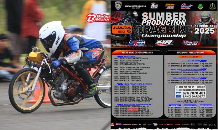 BalapMotor.Net – Promotor balap paling konsisten menggelar event yaitu Sumber Production siap menggelar gelaran drag bike pada hari Sabtu 8 Februari 2025.