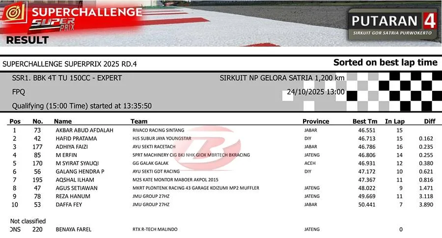 BalapMotor.Net – Akbar Abud berhasil menjadi pembalap terkencang pada sesi kualifikasi Bebek 4T TU 150cc (MP1) Superchallenge Superprix Seri ke-4.