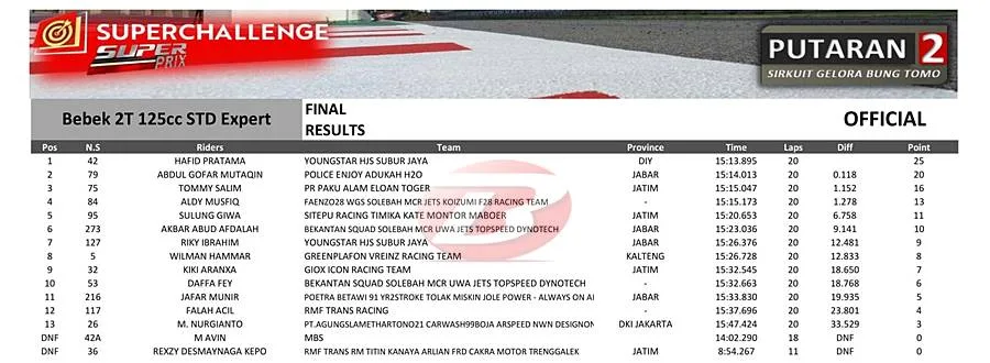 BalapMotor.Net – Hafid Pratama sukses mendominasi pertarungan kelas Bebek 2T STD 125cc Superchallenge Superprix Seri 2 di sirkuit GBT Surabaya (5/7).