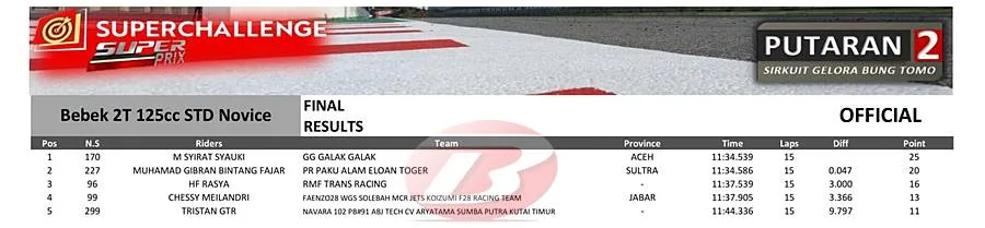 “Alhamdulillah untuk Bebek 2 tak bisa tampil maksimal dan double winner. Semoga di race lain nanti bisa tampil baik lagi,” ungkap pembalap asal Aceh itu.
