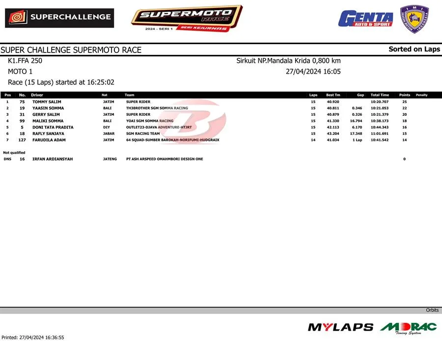 Namun pada pertengahan balapan, Tommy Salim berhasil mengambil alih posisi terdepan dari kakaknya. Sampai finis, Tommy tak terbendung untuk mengamankan podium juara.