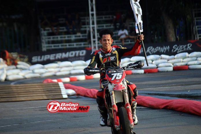 BalapMotor.Net – Pertempuran Moto1 kelas utama FFA 250 di kejuaraan Superchallenge Supermoto Race Seri Kejurnas Round 1 di Yogyakarta berlangsung begitu seru.