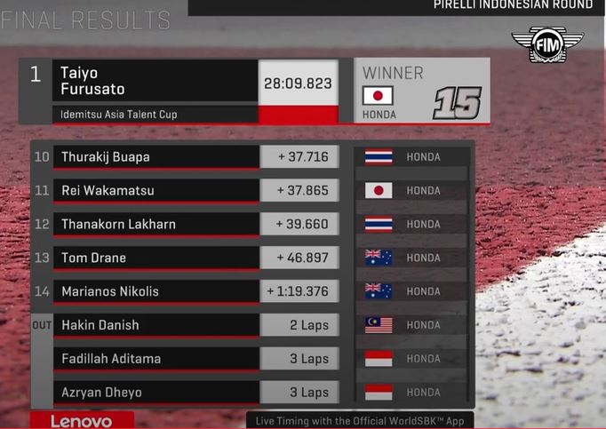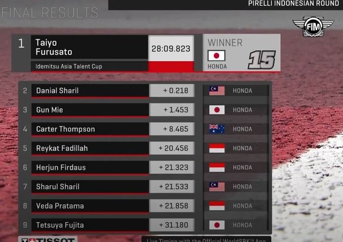 Taiyo Furusato menjadi jawara pada race 1 Idemitsu Asia Talent Cup (IATC) Mandalika yang merupakan race pertama yang digelar di sirkuit ini. Start dari grid ke-6, Taiyo Furusato memang skillnya di atas rata-rata, makanya mampu memimpin setelah lap ke-6.
